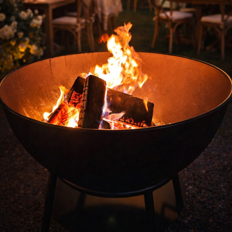 Unsere stilvolle Feuerschale sorgt für eine warme, gemütliche Atmosphäre bei eurem Event.
